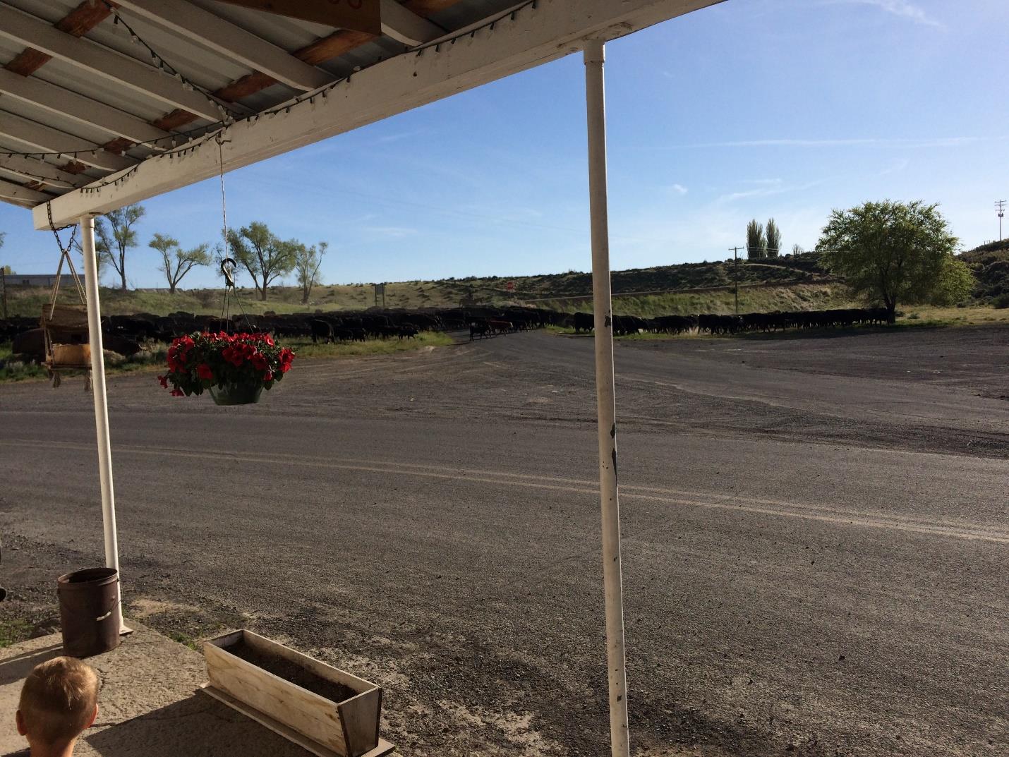 We get up early, pack our gear and park our bikes in front of the Store/ Bar / Restaurant. The wife of the owner is just sweeping the floor and opens early to make us breakfast consisting of Bacon, Eggs and Home fried potatoes. As we are enjoying our food someone storms in and yells: “Boys, you better move your bikes, a cattle drive is coming thru”! We hurry outside and roll the bikes behind the store. We watch as four Cowboys herd about 200 cattle down the road, just in the direction of our travel.